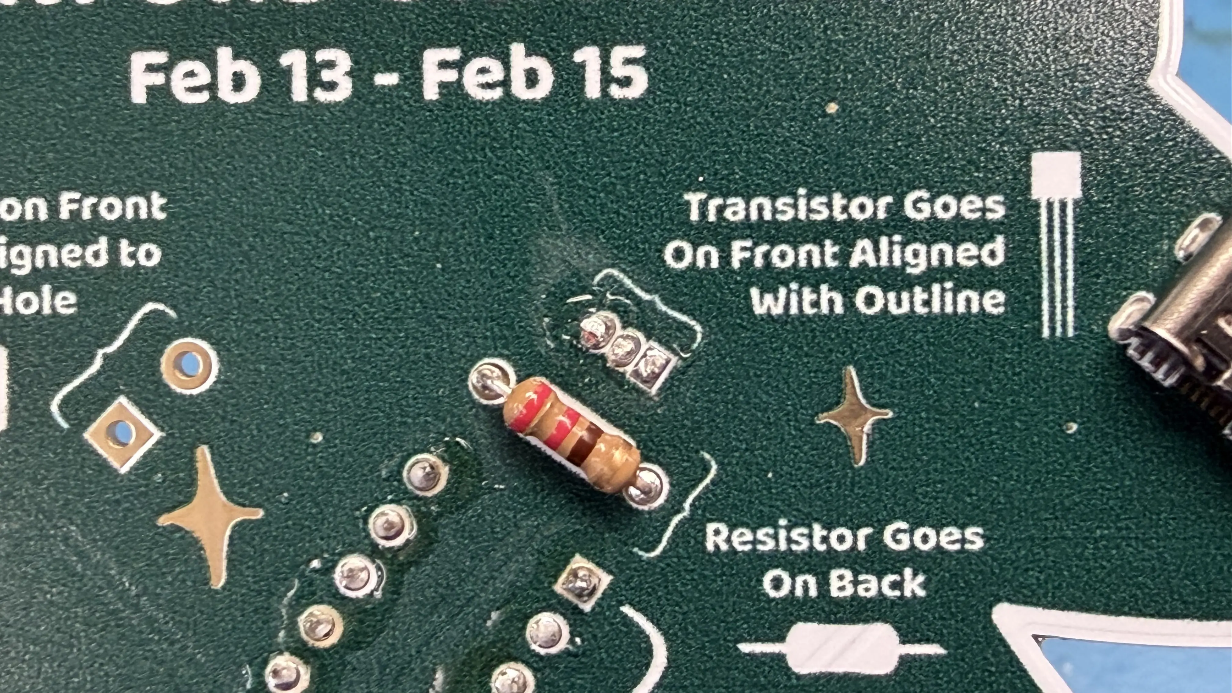 Continue soldering for the rest of the components. Locations of all components are indicated on the back. If you're having trouble keeping the components in place when you turn over the board, try spreading the leads of the component as demonstrated in the images below.